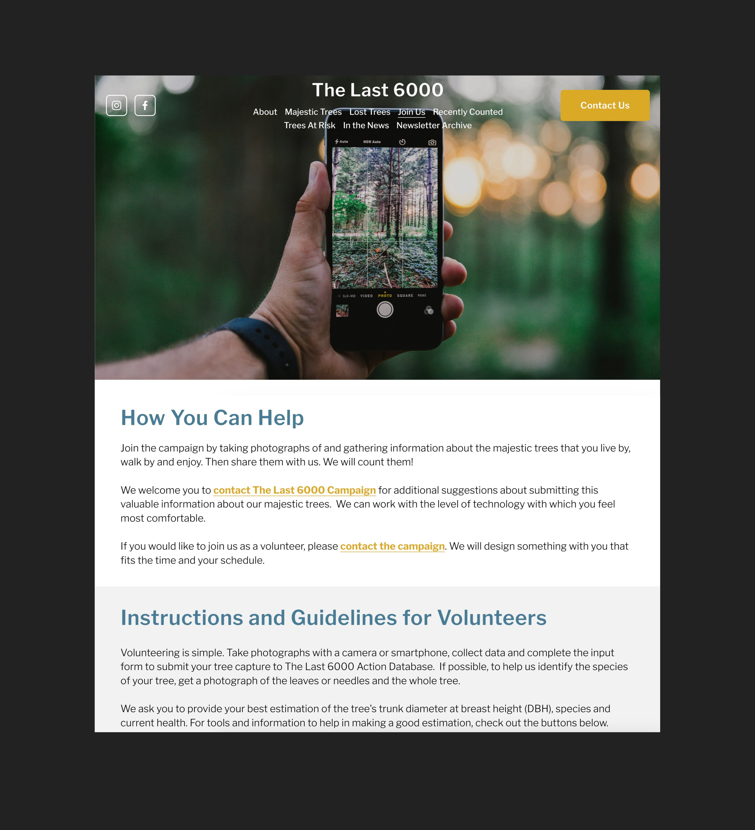Prior to the official campaign launch in 2019, they hired Numinosity to create a recognizable brand and website that would become the foundation for the campaign, initially housing brochure information about the cause, education and instruction for citizens ready to collect tree data, and a simple interface and single point of entry for straightforward, mobile accessible form submission and data capture.
